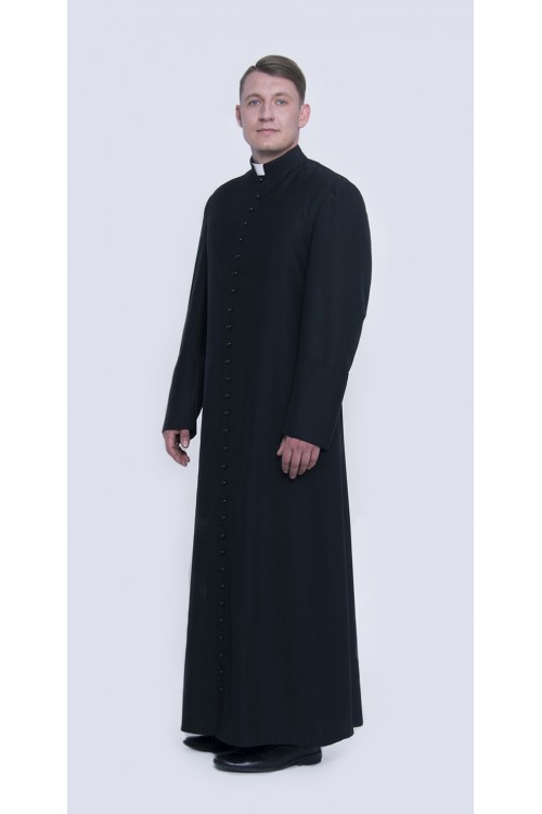 Elegant black cassock in the typical Roman cut. Classical style with three double pleats and pockets, with buttons or other other fasteners. Made of polyester fabric blend, a perfect material for making cassocks. It is easy to maintain – freshening it up and ironing are no problem. The garment is stiffened at the chest and shoulders with Italian-style inserts. It has a high-quality lining on the upper body, back and sleeves. The fabric is an alternative to silk - it is breathable and absorbs moisture.