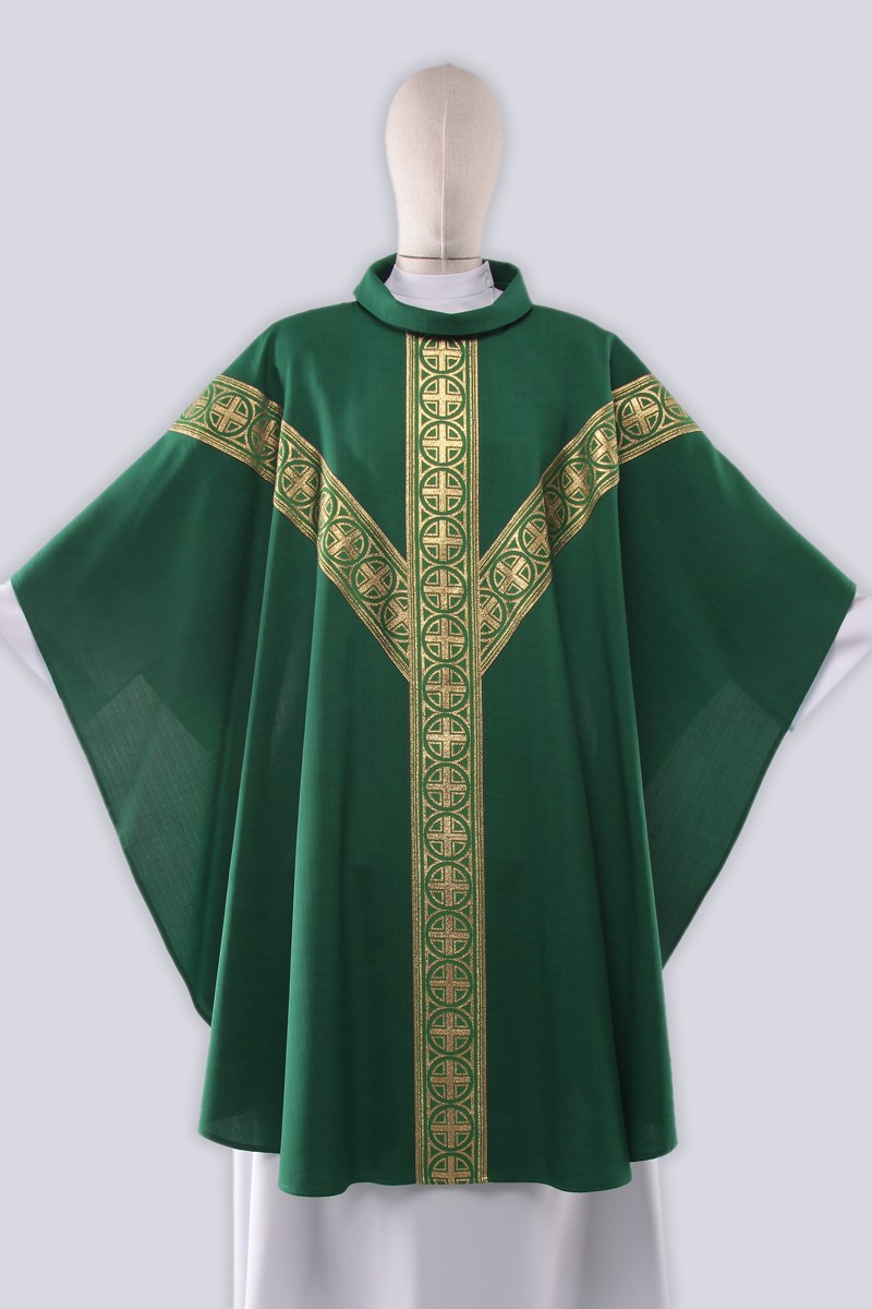 A beautiful festive chasuble with a decorative belt. The decoration - a liturgical motif in gold - is in the front and back of the garment. This style is also available with a stole.