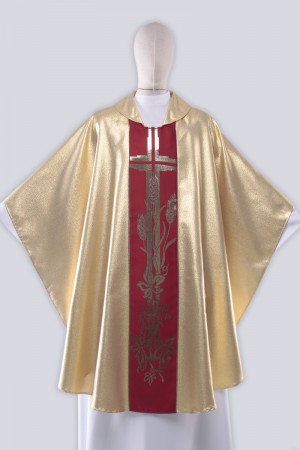 A beautiful festive chasuble with a decorative belt. The decoration - a liturgical motif in gold - is in the front and back of the garment. This style is also available with a stole.