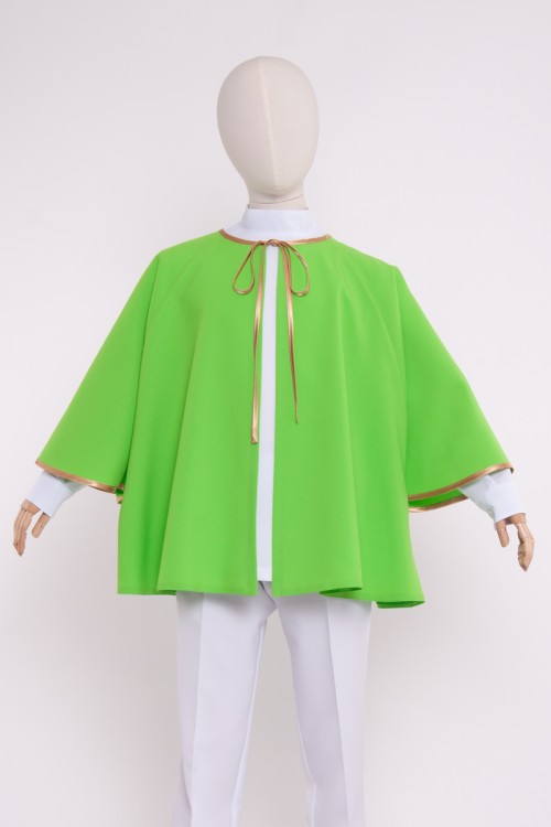 A playful yellow-green pelerine with elblow-length sleeves is suitable for choirs or other music groups of all ages: from children, teenagers to adults. It is mainly intended for girls and ladies, but boys can wear it in dark colors like navy blue or black. This product’s style is characterized by a wider front and back and wide sleeves. A cinnamon-gold trimming serves as a decoration for the sleeves and fastener.