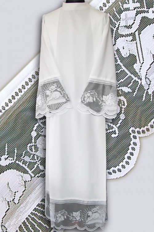 Alb for priests in white with delicate lace ornaments and a beautiful liturgical motif. The sleeves and the bottom part are lined with lace. Available in three materials: gabardine (polyester) cotton with viscose and wool-polyester.