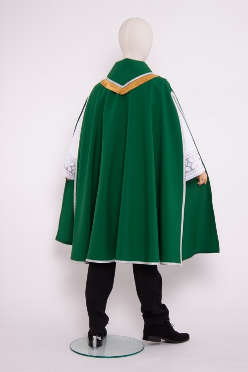 Pelerine with long slits at the sides. This garment is intended for altar boys, lecturers, choirs or musical church groups. Beautifully decorated with a shiny band with copper-colored tassels. This product has a pointed collar and is fastened with strings. Our pelerine is made of high quality material to last the choir many years. Available in several lengths - from 90 to 130 cm.