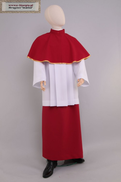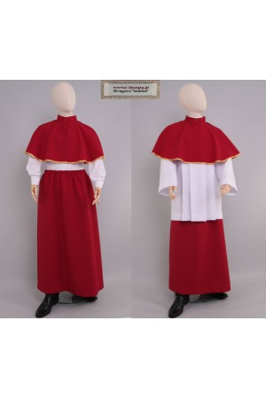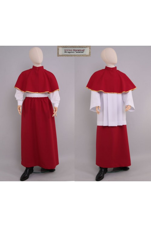 A set for altar servers and lectors in red consisting of a simple A-line skirt and a band collar decorated with a white-gold ribbon. This product is also available in other colors.