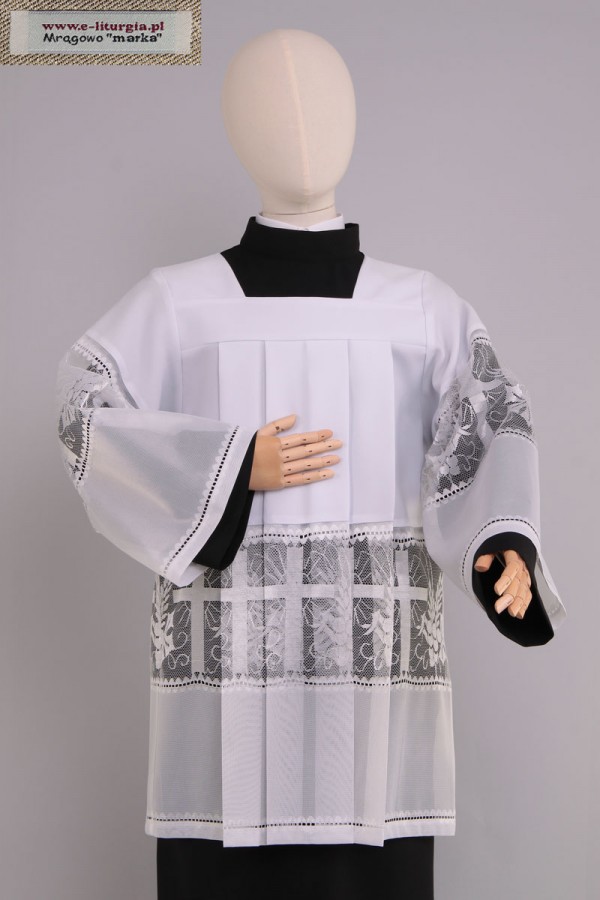 The surplice is decorated with delicate lace on the sleeves and at the bottom of the garment.