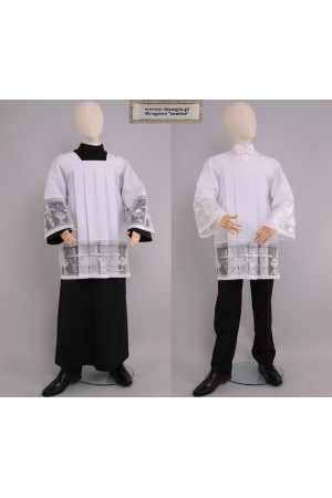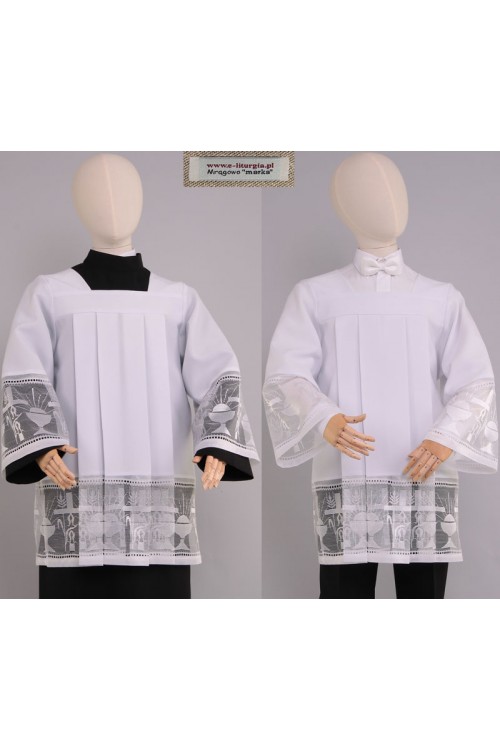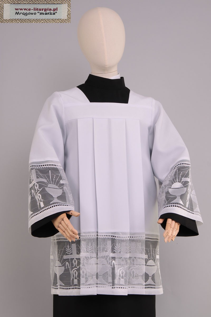 The surplice is decorated with delicate lace on the sleeves and at the bottom of the garment.